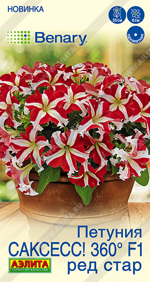 Необычная серия крупноцветковых петуний с громким названием «SUCCESS! 360° F1» («Успех!»). Растения настолько генетически однородные по своему габитусу, что обладают исключительной декоративностью при обзоре с любого ракурса! Кустики высотой около 30-35 см, шириной около 30 см. Обладают повышенной энергией роста, отлично ветвятся, образуя густой шар. Не требуют прищипывания и формирования. Цветки диаметром до 6-8 см, очень выразительные за счет насыщенной гаммы окрасок. Рано распускаются и далее непрерывно цветут, обильно украшая растения до осенних холодов. При должном уходе гибриды прекрасно растут в горшках, вазонах, балконных контейнерах. В садовых клумбах и рабатках они прекрасно выглядят в виде ковровых посадок.