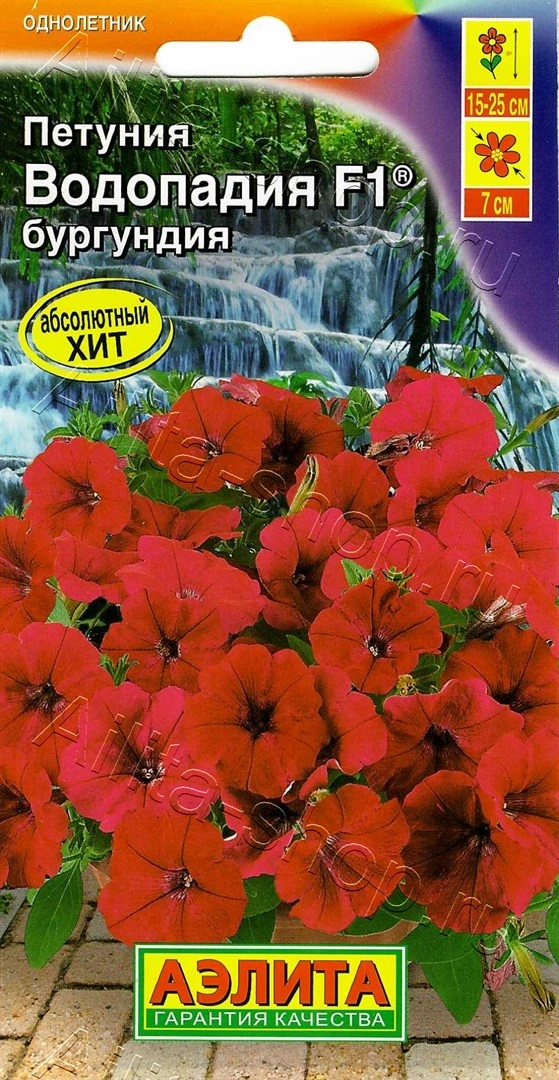 Абсолютный хит! Серия многоцветковых петуний каскадного типа, которая отличается совершенно новой полуампельной формой. Уникальность этих гибридов в том, что новые цветоносные побеги образуются без прищипки в пазухах листьев в середине куста, не оставляя пустот. Растения формируют пышные кустики, высотой 15-25 см. Поникающие побеги длиной до 70 см полностью усыпаны яркими насыщенными цветками  Ø 7 см и спускаются восхитительным водопадом. Гибриды устойчивы к повышенным температурам и неблагоприятным погодным условиям. Петунии Водопадия F1® наилучшим образом подходят для подвесных кашпо и корзин.