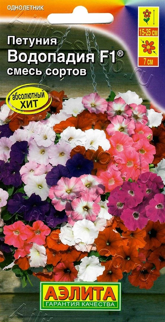 Абсолютный хит! Серия многоцветковых петуний каскадного типа, которая отличается совершенно новой полуампельной формой. Уникальность этих гибридов в том, что новые цветоносные побеги образуются без прищипки в пазухах листьев в середине куста, не оставляя пустот. Растения формируют пышные кустики, высотой 15-25 см. Поникающие побеги длиной до 70 см полностью усыпаны яркими насыщенными цветками  Ø 7 см и спускаются восхитительным водопадом. Гибриды устойчивы к повышенным температурам и неблагоприятным погодным условиям. Петунии Водопадия F1® наилучшим образом подходят для подвесных кашпо и корзин.