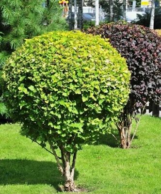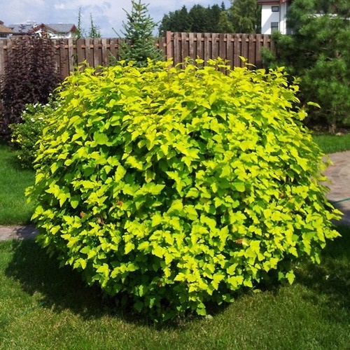 Пузыреплодник калинолистный Лютеус (Physocarpus opulifolius Luteus) - кустарник высотой до 2,5-3 метров с раскидистыми слегка поникающими ветками. Кора на старых ветках отслаивается полосками. Цветет в июне – июле бело-розовыми цветками, собранными в соцветия размером около 5 см. После цветения образуются гроздья красных коробочек, которые хорошо смотрятся на фоне золотистой листвы. Растет очень быстро, у взрослого растения за один сезон от корня отрастают побеги замещения высотой 1,5-2 м, которые на следующий сезон зацветают. Нетребователен к почве. Хорошо растет на солнце и в тени, но теряет при этом яркий свой окрас . Нечувствителен к загрязнению и сильным ветрам . Зимостоек.