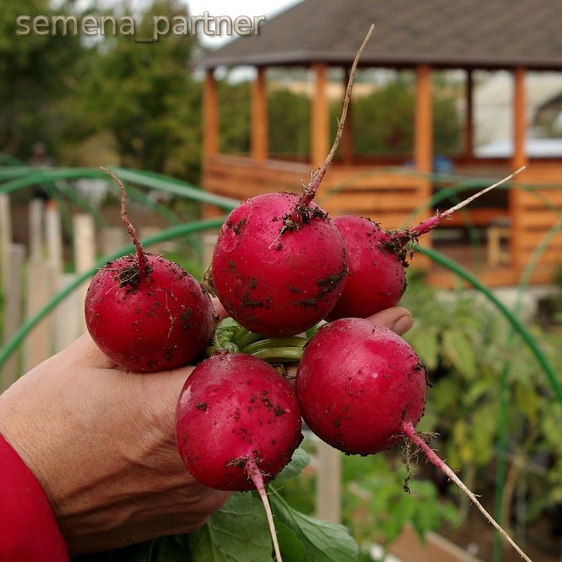 Гибрид раннеспелый. От всходов до технической спелости 22-25 дней. Корнеплоды округлой формы, с гладкой поверхностью, идентичные по форме, густо красного цвета. Товарные корнеплоды в диаметре 25-30мм, массой до 30 г. Розетка листьев компактная, прямостоячая. Мякоть сочная плотная хрустящая белая, искрящаяся. Вкусовые качества отличные, не смотря на присутствие лёгкой, пикантной остроты. Товарность корнеплодов высокая. Даже при продолжительном хранении в корнеплодах не образуется пустот, вялых, дряблых или волокнистых тканей. Пригоден для выращивания в открытом грунте и в течение 7- 9 месяцев в защищённом грунте, не подвергаясь цветушности. Гибрид предпочитает хорошо структурированные, средней питательности почвы. Сбор корнеплодов облегчается за счёт неглубокого нахождения в почве. Схема посадки 10х5см. Урожайность 3,5-4,5 кг/м2.