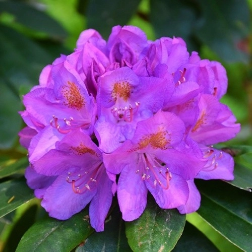 Рододендрон Catawbiense Grandiflorum - вечнозеленый рододендрон, обладает высокой декоративностью. Листья у него темно-зеленые, блестящие, эллиптические, 6-14 см в длину и около 4-5 см в ширину. Цветет розовое дерево в июне, около трех недель, каждый год и обильно. Цветки у гибридного рододендрона крупные (5-6 см в диаметре), колокольчатые, сиренево-пурпурных тонов, иногда розовые, белые. Собраны цветки в плотные пучки по 15-20 штук.