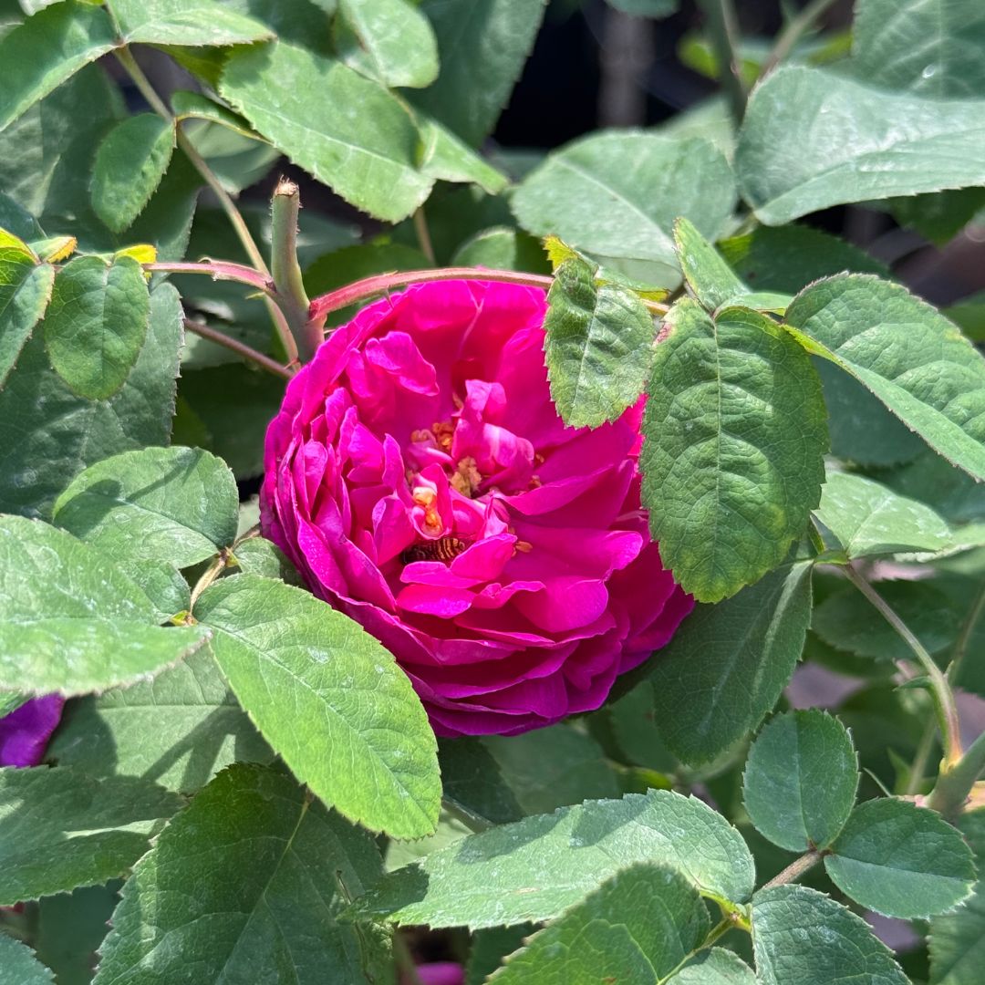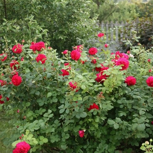 Цветок темно-малиново-красный, чашевидный, края внутренних лепестков загнуты внутрь цветка, густомахровый (75 - 80 лепестков), обладает насыщенным ароматом старой розы. Цветение очень обильное, продолжительное, цветки собраны в небольшие соцветия. Растение сильнорослое с поникающими побегами. Лист темно-зеленый, крупный, полуглянцевый.