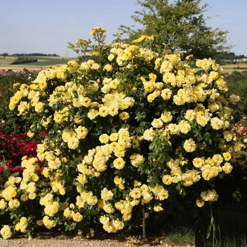 Удлиненные, элегантные бутоны раскрываются медленно, как чайно-гибридные розы. Цветки желтые, с красивыми золотистыми тычинками в центре, слегка чашевидные. Едва раскрывшись, цветки ярко-желтые или лимонные, затем совсем слегка бледнеют. Они появляются в кистях по 5-15 шт. Листва мелкая, блестящая, устойчивая к заболеваниям. Рано начинает цвести, первая волна цветения очень обильная, но и затем куст никогда не стоит без цветов до самой осени.