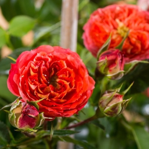 Очень красочная и довольно компактно растущая роза Carmen из серии "Starlet". Яркий оранжевый цвет с желтым реверсом вызывает в воображении атмосферу цветущего средиземноморского сада. Цветки диаметром 5-6 см, густомахровые, розетковидные и очень прочные. Этот сорт наращивает очень сильные базальные побеги, быстро образуя большой куст высотой 150-200 см и обеспечивая непрерывное цветение в течение лета. Листва средне-зелёная, очень блестящая, высокоустойчивая к мучнистой росе, устойчивая к чёрной пятнистости. Рекомендуется для террас, балконов, контейнеров, живой изгороди.