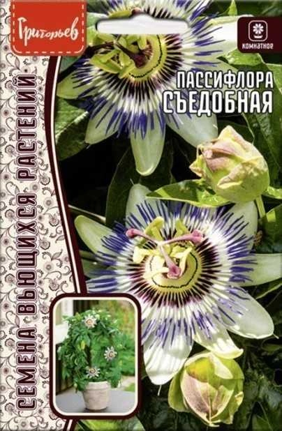 Является превосходным вьющимся растением для дома или зимнего сада! Многие любят его за роскошные цветы и незамысловатый внешний вид. Культура быстро растёт, отличается жизнестойкостью и имеет волшебный аромат. Представители этого вида имеют извилистые лианы и голые побеги длиной до 4,5 м. Глянцевые листья состоят из трех долей и имеют зубчатую форму по краям. Цветы окрашены в белые или лилово-белые цвета и имеют диаметр до 5-7 см. Плоды страстоцвета имеют желтовато-зелёный или тёмно-фиолетовый окрас и яйцевидную форму. Первые плоды растение приносит на второй год после посева. Они очень вкусные и обладают лечебными свойствами, нам они известны под названием «маракуйя».