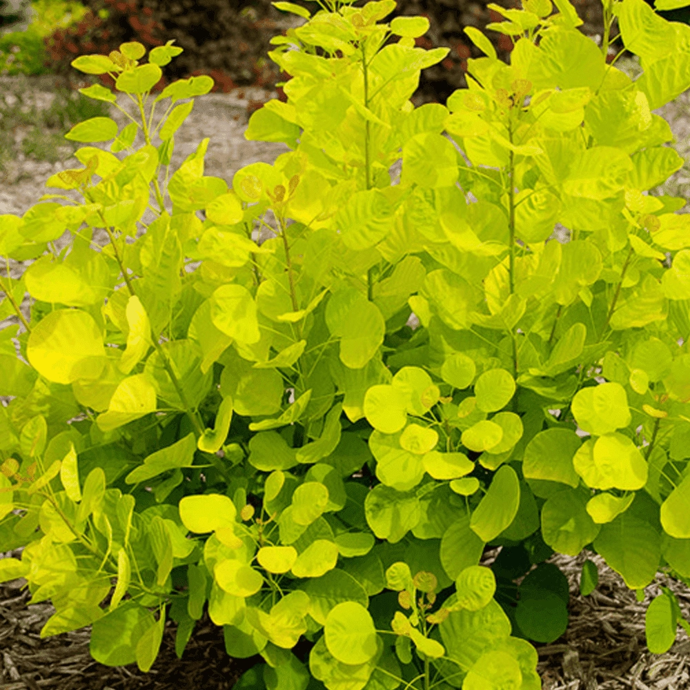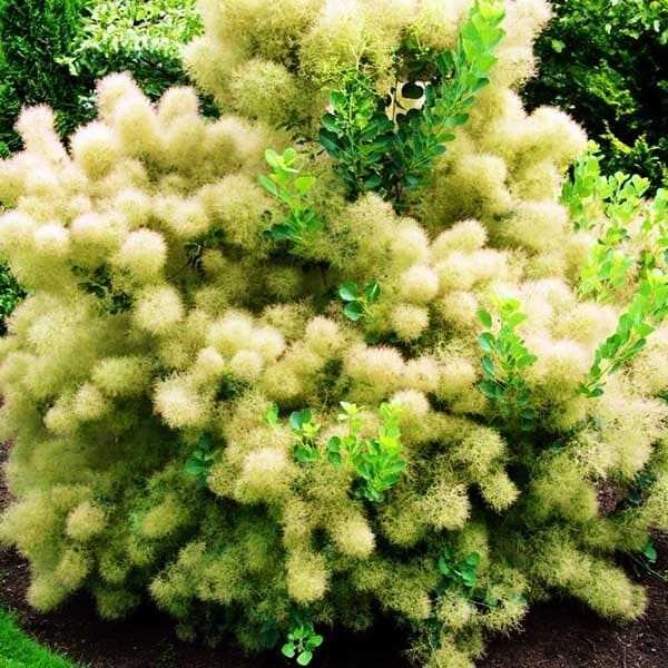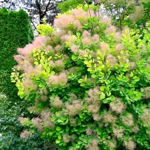 Скумпия кожевенная "Голден Спирит" ещё называют Smoke tree - Дымное дерево, из-за оригинальных пушистых метёльчатых соцветий розового цвета, которые напоминают дым и отблески огня.В период цветения Скумпия очень декоративна - её будто окутывает легкое дымчатое облако.Цветки очень мелкие, розового цвета, собраны в негустые пушистые свободные метелки, очень декоративны. Когда происходит процесс созревания плодов, культура становится наиболее привлекательная.Листья обладают лимонно-желтой окраской. Осенью они становятся оранжевыми, делая куст ярким и выделяющимся.