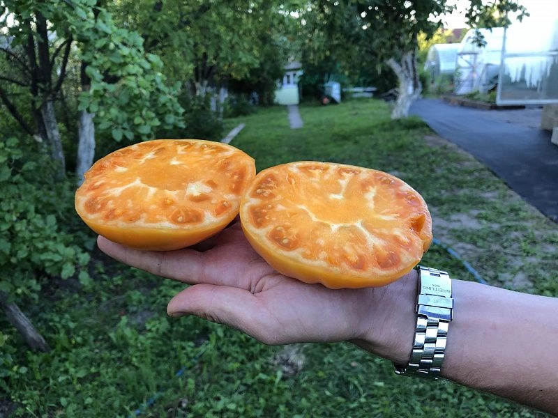 Сорт среднеранний, индетерминантный, относится к типу биф-томатов. От высадки 60 дневной рассады до сбора плодов 40-45 дней. Первое соцветие образуется над 9 листом, последующие через 3 листа. Плоды оранжевого цвета, плоскоокруглые, с множеством ярко выраженных ребер. Масса плодов может достигать 400-600 г. Вкус нежный, сладкий, ароматный, с присутствием фруктовых ноток. В поперечном разрезе практически отсутствуют семенные камеры и семена. Для поддержания большого урожая необходимо проводить дополнительные подкормки. Сорт устойчив к основному комплексу болезней томатов. Плотность посадки 3-4 растения/м2. Урожайность 16-18 кг/м2. Один из самых лучших оранжевоплодных сортов томатов.