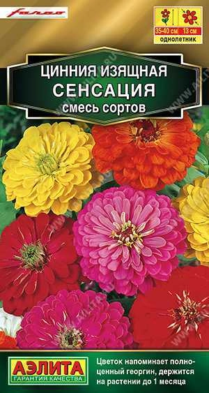 Циннии СЕНСАЦИЯ итальянской компании Farao – результат успешной селекции на очень крупный, густомахровый цветок (Ø 10-13 см). Едва ли вы найдете такое же крупное соцветие у других сортов и гибридов. Напоминающий полноценный георгин, эффектный цветок держится на растении более месяца. Крепкие, раскидистые кусты 35-40 см высотой красиво смотрятся в среднем ярусе миксбордера. Букеты из цинний СЕНСАЦИЯ долго стоят в воде.