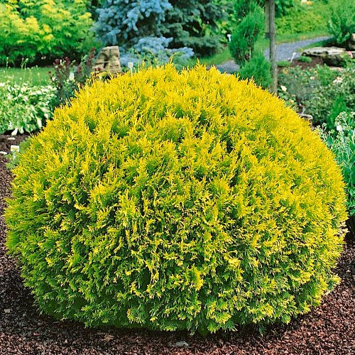 Карликовый кустарник с овальной кроной. Кончики побегов желтые, осенью имеет медный оттенок. Внутри ярко-зеленый.
