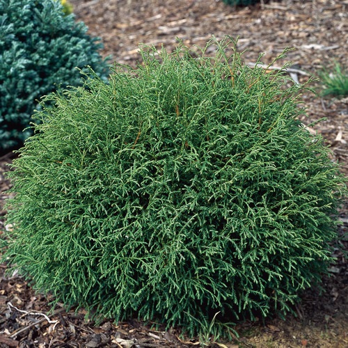 Туя шаровидная Мистер Боулинг Болл - карликовая, почти шаровидная форма, необычайно плотная. В высоту и ширину примерно одинаковых размеров - от 0,6 до 0,9 м. Годовой прирост 5 см.