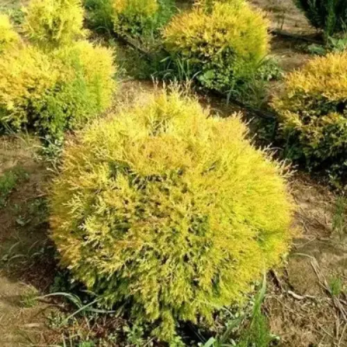 Туя западная Глобоза Ауреа – популярный вечнозеленый кустарник, имеющий сферическую форму кроны. Растение обладает густой чешуйчатой хвоей, которая меняет цвет в зависимости от сезона. От зеленовато-желтого цвета летом, до бурого – зимой.