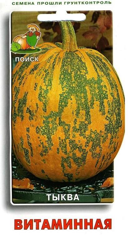 Тыква мускатная Витаминная – высокоурожайный позднеспелый сорт. Период от всходов до полного созревания плодов составляет 125–130 дней. Растение длинноплетистое, средней мощности. Плоды короткоовальные и короткоцилиндрические, широкие, сегментированные, с ребристостью к плодоножке. При полном созревании окраска буро-коричневая с розовым оттенком. Рисунок – темно-зеленая сетка, крупные, мелкие, округлые пятна. Кора тонкая, кожистая. Мякоть ярко-оранжевая, почти красная, хрустящая, сладкая, толщиной 5–10 см. Масса плода 6–7 кг. Сорт столового назначения.
