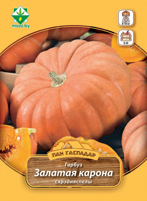 Среднеспелый сорт белорусской селекции. Период от всходов до начала уборки 110-120 дней. Относится к виду крупноплодной тыквы. Растение длинноплетистое. Плоды плоско-округлые, при полном созревании оранжевые или розово-оранжевые, массой 8-10 кг и более. Кора мягкая. Мякоть плотная, нежная, оранжевого цвета, содержит много каротина. Вкусовые и диетические качества отличные. В комнатных условиях хранится до 6 месяцев.
