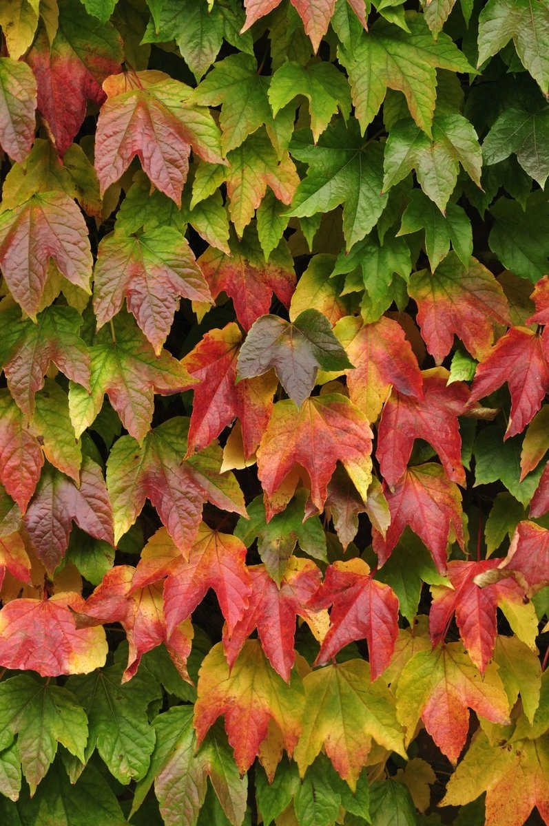 Листья: трехлопастные, грубо-зубчатые, округлые, волнистые по краям, темно-зеленые летом и темно-пурпурные осенью.