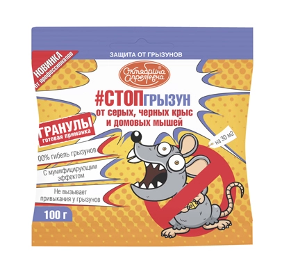 Предназначена для уничтожения любых видов грызунов - серых и черных крыс, домовых и полевых мышей на объектах различного профиля деятельности (включая жилые, пищевые, детские, лечебные) и незастроенных территориях. Пищевая основа - зерновая смесь на основе пшеницы или муки; аттрактанты - сахар и растительное масло; ароматизаторы, привлекательные для грызунов. Содержание бродифакума, одного из самых эффективных антикоагулянтов 2-го поколения, и специально подобранных аттрактантов значительно снижает репеллентные свойства родентицида и позволяет применять без предварительной прикормки грызунов. Приманка обеспечивает получение летальной дозы грызунами после однократного поедания приманки и гибель через 4-12 дней после ее употребления, что препятствует появлению чувства настороженности у грызунов и дает возможность максимального охвата популяции дератизационными мероприятиями
