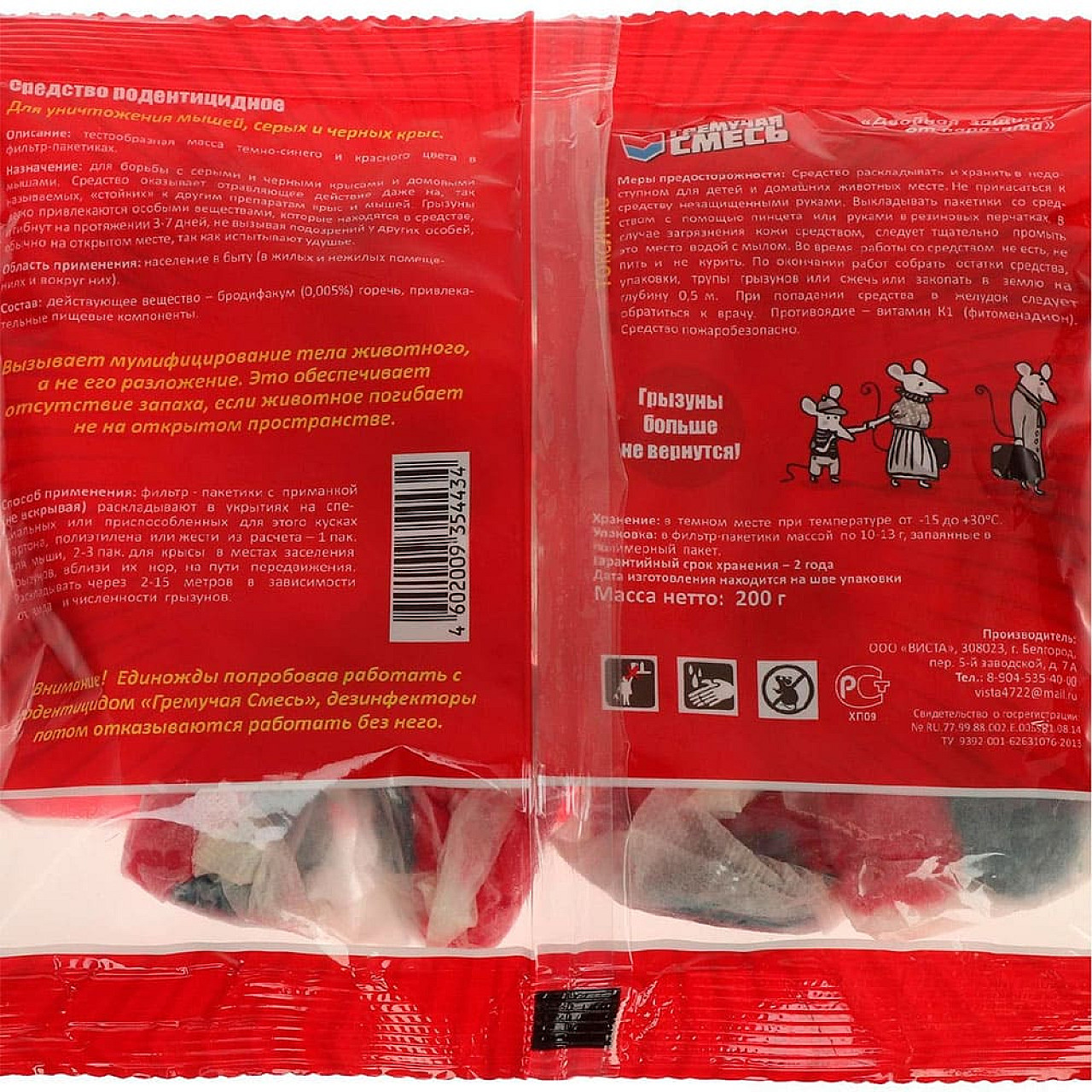 Гремучая смесь – это приманка для мышей, крыс и других грызунов. Которая позволяет эффективно справиться с грызунами как в домашних условиях, так и в подсобных, складских помещениях и общественных зданиях. Основное действующее вещество - бродифакум (0.005%) – это антикоагулянт, который нарушает свертываемость крови. Грызуны съедают летальную дозу уже после первого подхода к корму, и затем любое внешнее или внутреннее повреждение приводит к гибели.Раскладывайте приманку, не вынимая из бумажных фильтр-пакетов. Они пропускают запах, привлекая вредителей, но при этом не поддаются действию влажности и других разрушающих факторов, поэтому их можно использовать как в помещении, так и снаружи здания.Перед работой наденьте защитные перчатки и не допускайте попадания токсинов на кожу и в глаза. Если в доме есть дети и домашние животные, устанавливайте приманку в недоступных для них местах, например, внутри приманочных домиков.
