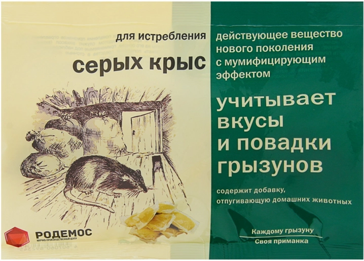 В состав мягких брикетов, помимо действующего вещества, входят как привлекатели свежее тесто с сыром, подсолнечное масло и ваниль, каждый брикет отдельно завернут в съедобную рисовую бумагу – это обеспечивает исключительную привлекательность и 100 % поедаемость приманки крысами.