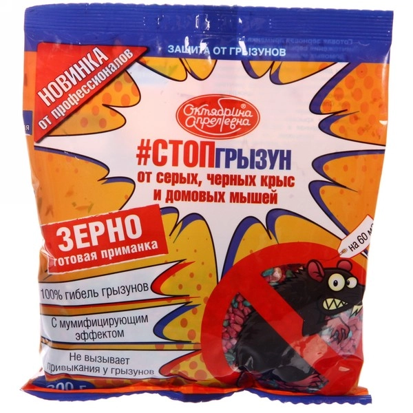 Предназначена для уничтожения любых видов грызунов – серых и черных крыс, домовых и полевых мышей на объектах различного профиля деятельности (включая жилые, пищевые, детские, лечебные) и незастроенных территориях Пищевая основа – зерновая смесь на основе пшеницы или муки; аттрактанты – сахар и растительное масло; ароматизаторы, привлекательные для грызунов. Содержание бродифакума, одного из самых эффективных антикоагулянтов 2-го поколения, и специально подобранных аттрактантов значительно снижает репеллентные свойства родентицида и позволяет применять без предварительной прикормки грызунов. Приманка обеспечивает получение летальной дозы грызунами после однократного поедания приманки и гибель через 4-12 дней после ее употребления, что препятствует появлению чувства настороженности у грызунов и дает возможность максимального охвата популяции дератизационными мероприятиями.